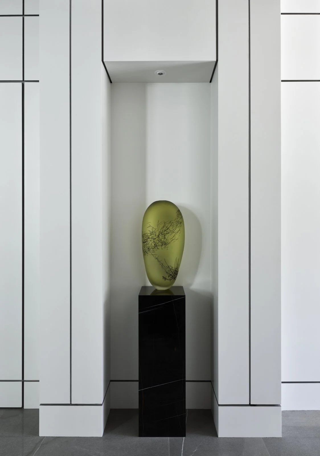Handblown in a range of ovoid forms, these vases act as a canvas for the automatist line drawings exclusive to our Scribe series. The unique pattern of each vessel enriches their minimalist yet expertly crafted form, creating a beautiful flourish of line against a backdrop of vibrant colour. The sandblasted finish creates a soft luminescence, and with a shallow profile, these easily create an artistic presence in areas with limited depth, such as shelves and recessed areas.